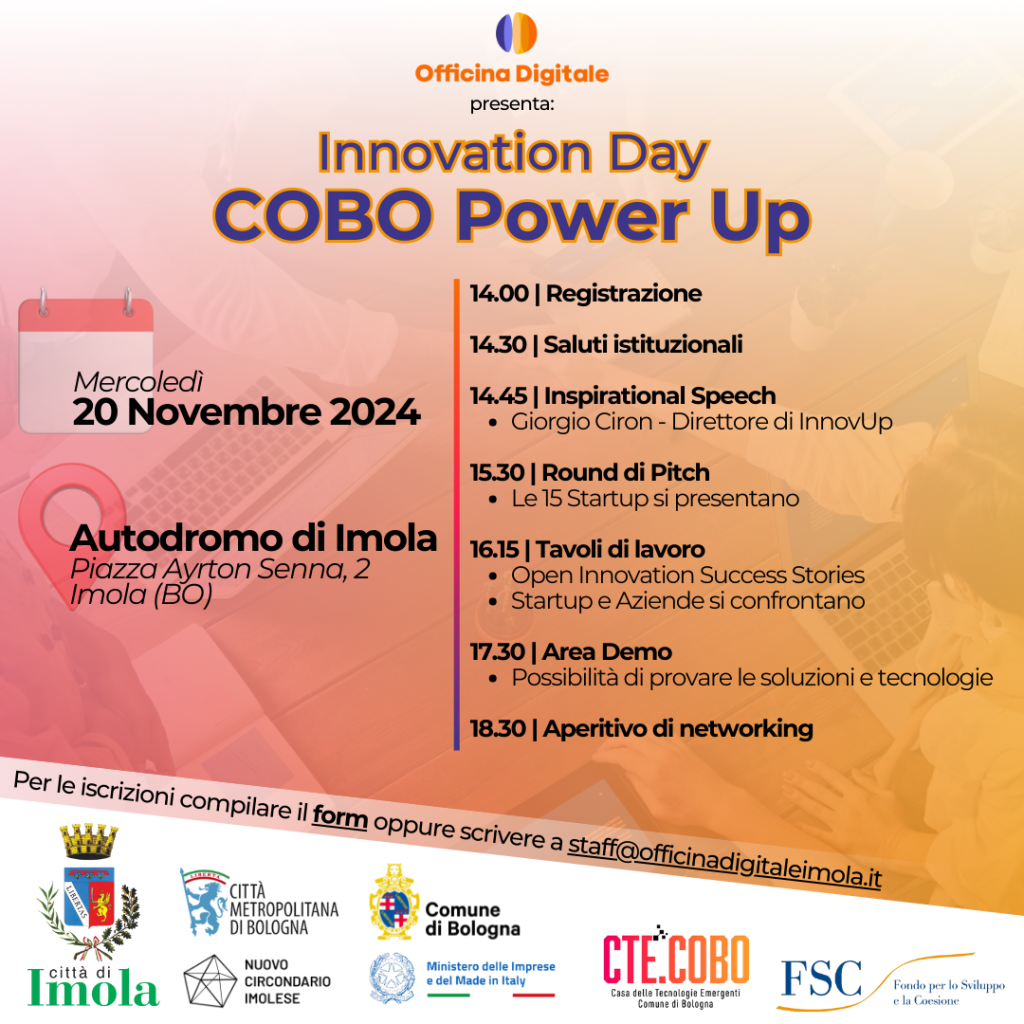 Dalla registrazione iniziale alle 14.00, fino all’aperitivo di networking alle 18:30, la giornata offrirĂ speech ispirazionali, sessioni di confronto tra startup e aziende, pitch delle 15 startup di CTE COBO Power Up e un’area Demo dove poter toccare con mano le tecnologie piĂą avanzate.