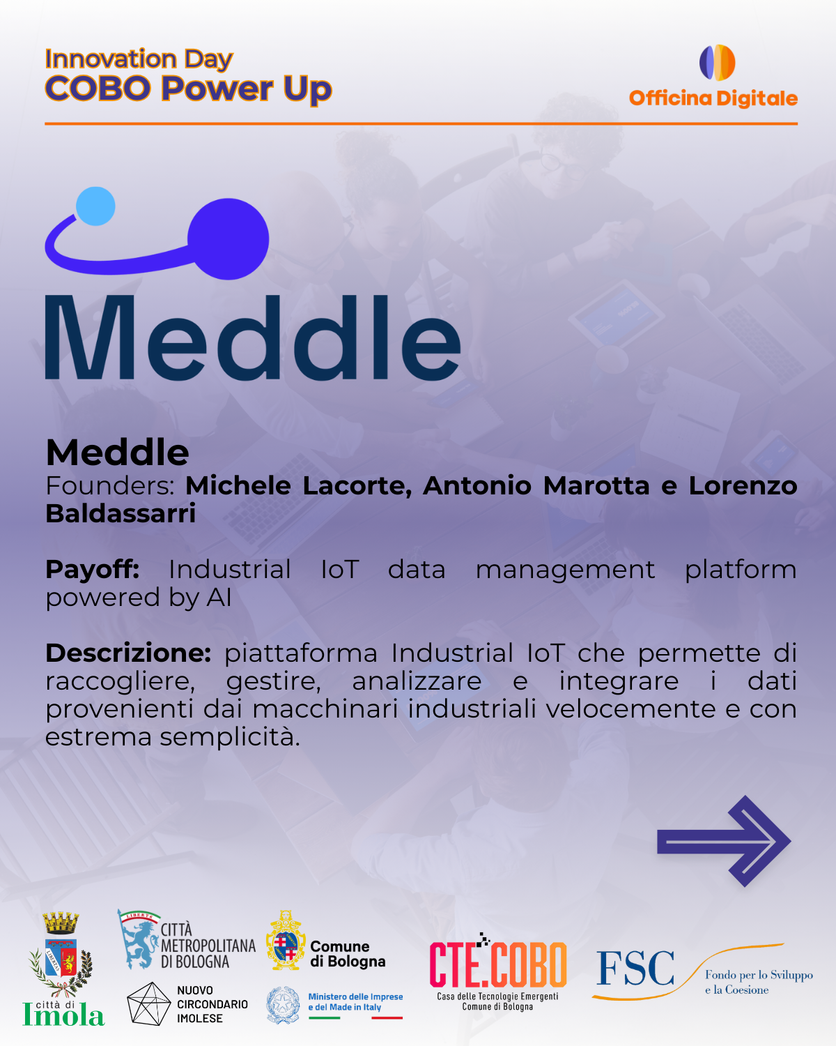 - Meddle (Founders: Michele Lacorte, Antonio Marotta e Lorenzo Baldassarri): piattaforma Industrial IoT per gestione e analisi dati macchinari.
