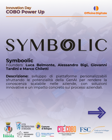 - Symboolic (Founders: Luca Belmonte, Alessandro Bigi, Giovanni Tardini e Marco Chiletti): piattaforme personalizzabili con GenAI per scalabilità della conoscenza aziendale.